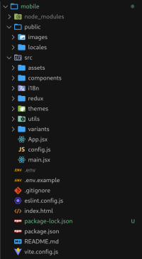 Le dossier mobile d'un projet SmartMaker contient un dossier public, un dossier src et des quelques fichiers de configuration, modèle que l'on retrouve dans la majorité des projets React.